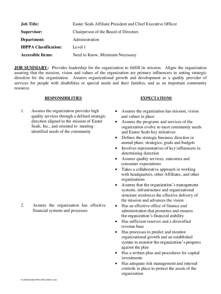 Job Title:Easter Seals Affiliate President and Chief Executive OfficerSupervisor:Chairperson of the Board of DirectorsDepartment:AdministrationHIPPA Classification:Level 1Accessible Items:Need to