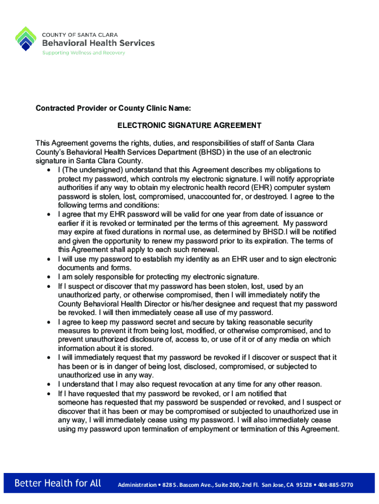 Contracted Provider or County Clinic Name: ELECTRONIC SIGNATURE AGREEMENT This Agreement governs the rights, duties, and responsibilities of staff of Santa Clara Counties Behavioral Health Services