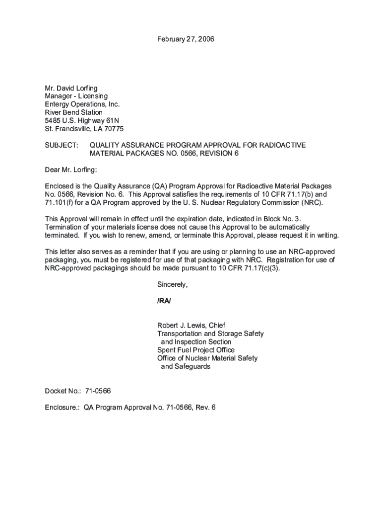 Get the free Ltr to David Lorfing, Entergy Operations, Inc., Quality ...