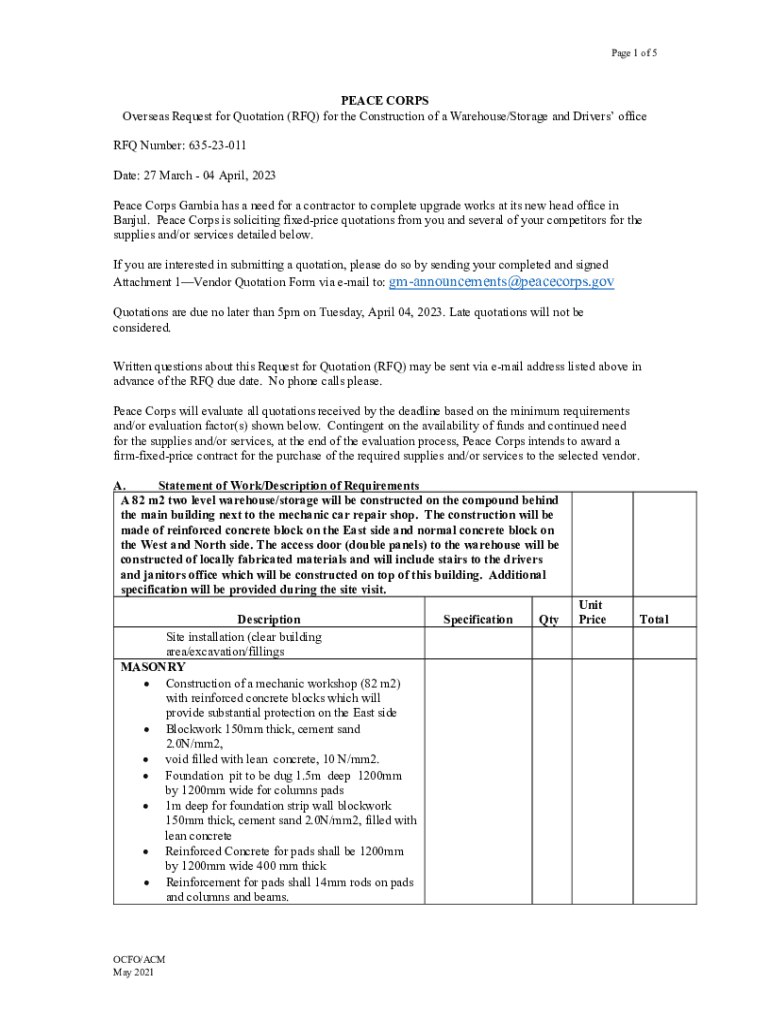Page 1 of 5PEACE CORPS Overseas Request for Quotation (RFQ) for the Construction of a Warehouse/Storage and Drivers office RFQ Number: 63523011 Date: 27 March 04 April 2023 Peace Corps Gambia has