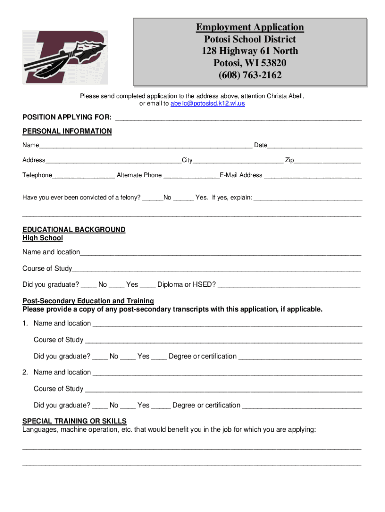 Employment application potosi school is a form that individuals need to fill out in order to apply for a job at Potosi School.