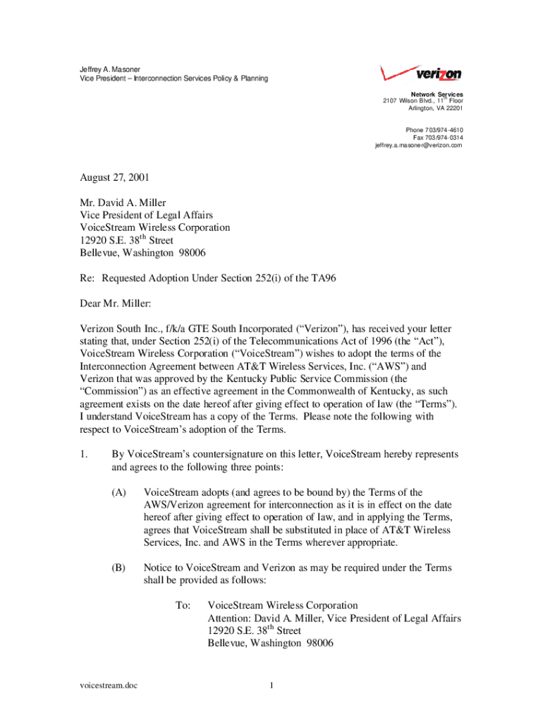 Jeffrey A. Mason her Vice President Interconnection Services Policy & Planning Network Services TH 2107 Wilson Blvd., 11 Floor Arlington, VA 22201Phone 703/9744610 Fax 703/9740314 jeffrey.a.masoner@verizon.comAugust