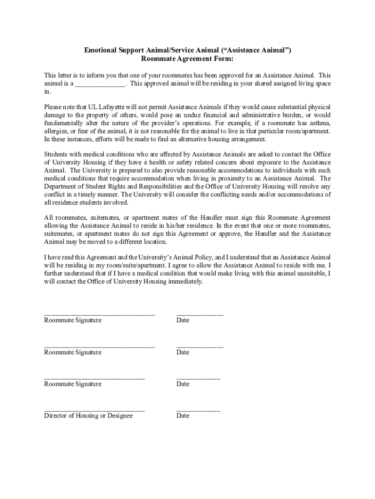 Emotional Support Animal/Service Animal (Assistance Animal) Roommate Agreement Form: This letter is to inform you that one of your roommates has been approved for an Assistance Animal. This animal
