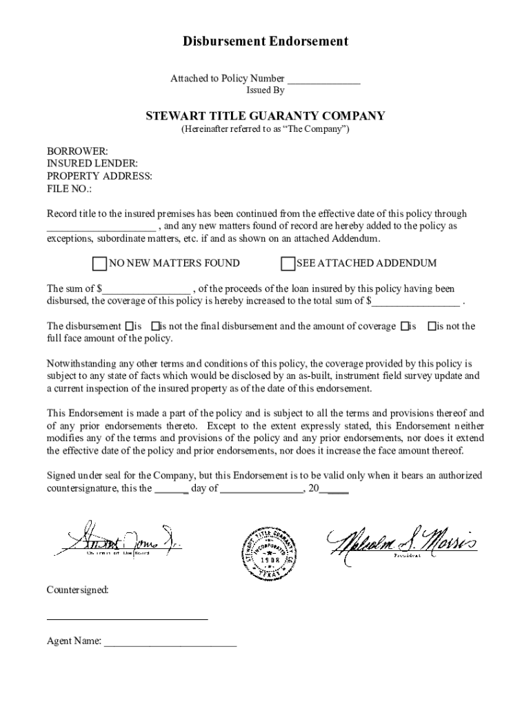 Disbursement Endorsement Attached to Policy Number ___ Issued Stewart TITLE GUARANTY COMPANY (Hereinafter referred to as The Company)BORROWER: INSURED LENDER: PROPERTY ADDRESS: FILE NO.: Record title