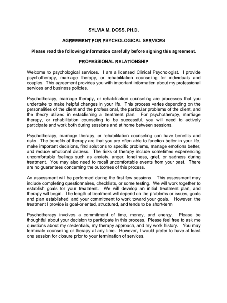 Get the free SYLVIA M. DOSS, PH.D. AGREEMENT FOR PSYCHOLOGICAL ...