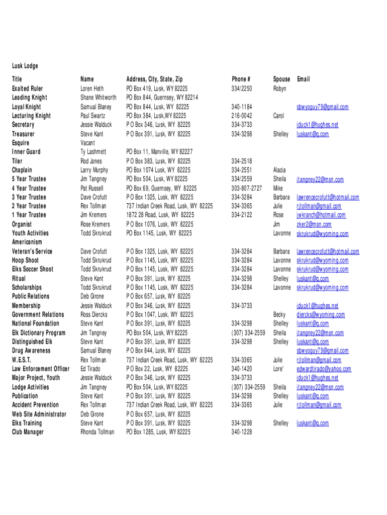 Get the free Lusk Lodge Title Name Address, City, State, Zip Phone # Spouse ...