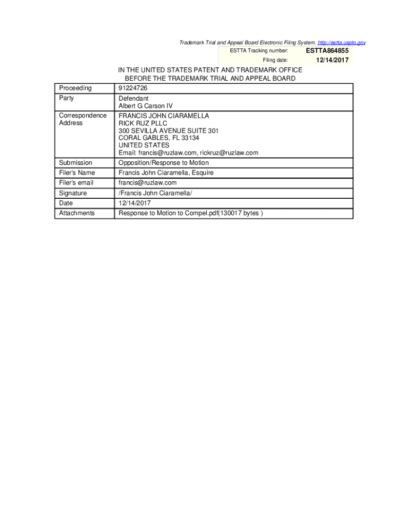 Trademark Trial and Appeal Board Electronic Filing System. http://estta.uspto.gov ETTA Tracking number: Filing date:Proceeding IN THE UNITED STATES PATENT AND TRADEMARK OFFICE BEFORE THE TRADEMARK