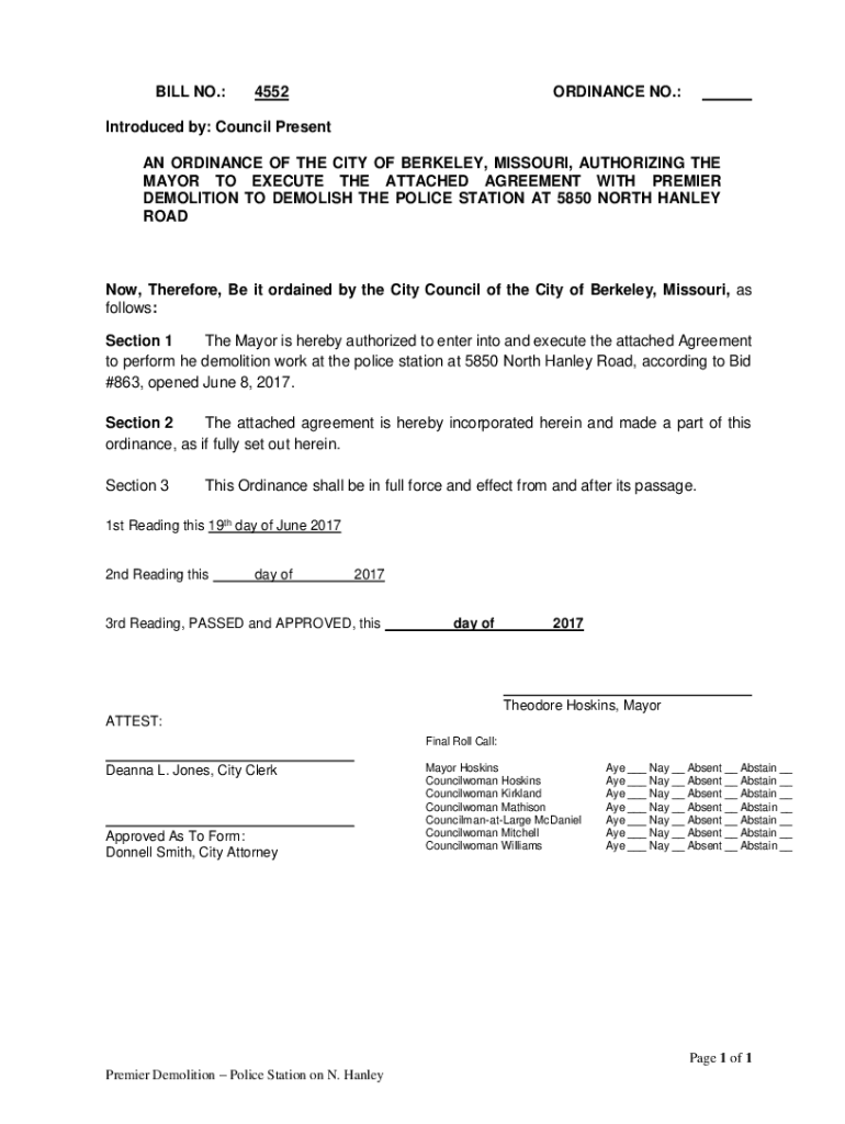 BILL NO.:4552ORDINANCE NO.:Introduced by: Council Present AN ORDINANCE OF THE CITY OF BERKELEY, MISSOURI, AUTHORIZING THE MAYOR TO EXECUTE THE ATTACHED AGREEMENT WITH PREMIER DEMOLITION TO DEMOLISH