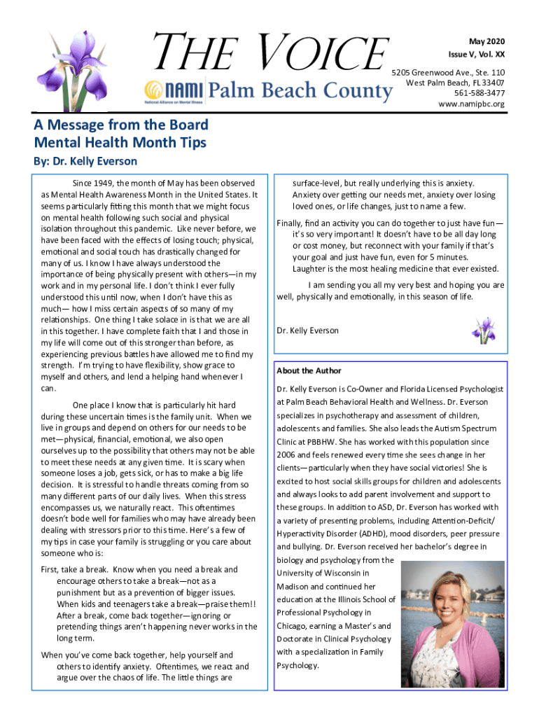 The Voice May 2020 Issue V, Vol. XX 5205 Greenwood Ave., Ste. 110 West Palm Beach, FL 33407 5615883477 www.namipbc.orgA Message from the Board Mental Health Month Tips By: Dr. Kelly Everson Since
