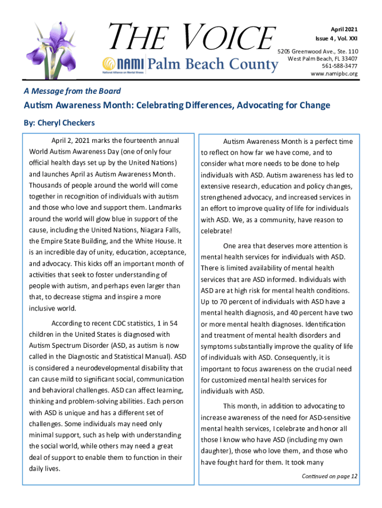 The Voice April 2021 Issue 4, Vol. XXI 5205 Greenwood Ave., Ste. 110 West Palm Beach, FL 33407 5615883477 www.namipbc.orgA Message from the BoardAutism Awareness Month: Celebrating Differences, Advocating