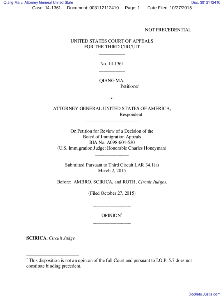 Get the free NOT PRECEDENTIAL OPINION Coram. 14-1361 - Qiang Ma v. Attorney General United State