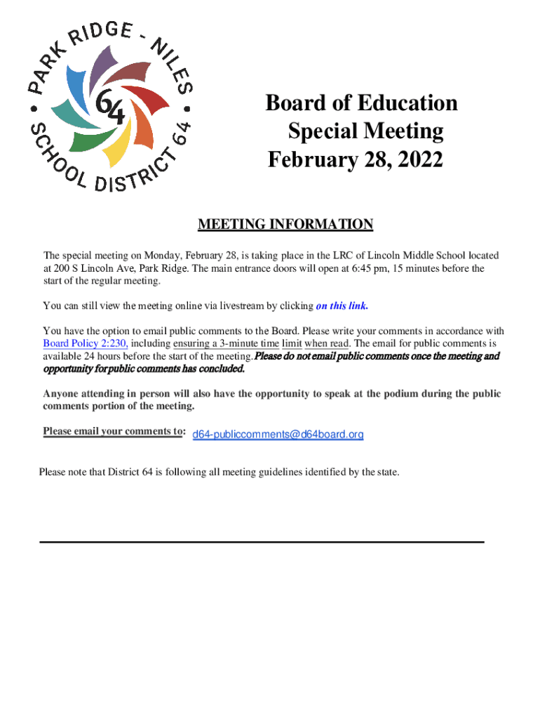 Board of Education Special Meeting February 28, 2022, MEETING INFORMATION The special meeting on Monday, February 28, is taking place in the LRC of Lincoln Middle School located at 200 S Lincoln Ave,