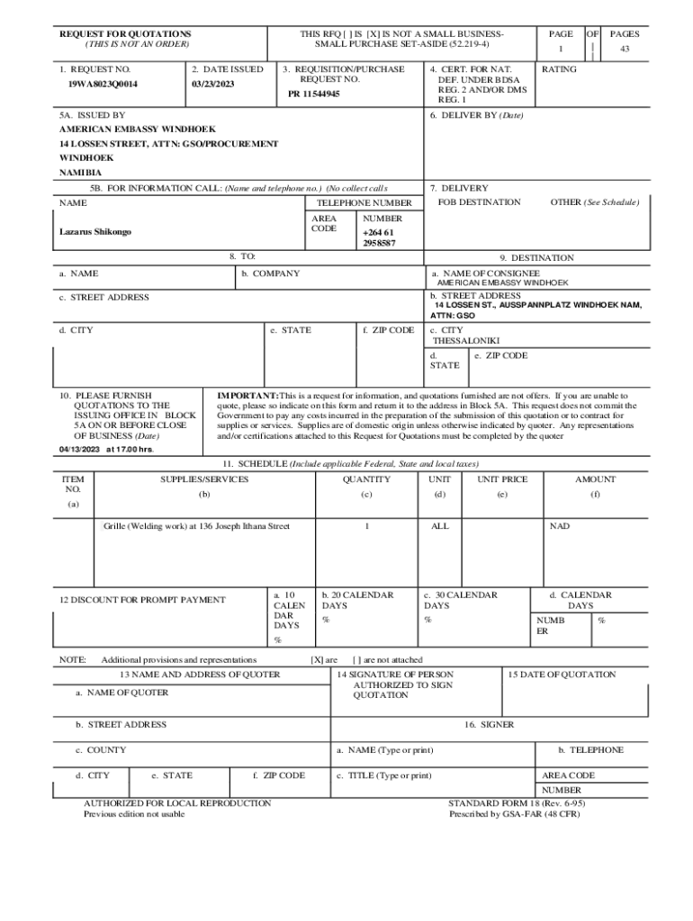 REQUEST FOR QUOTATIONS (THIS IS NOT AN ORDER) 1. REQUEST NO.THIS RFQ [ ] IS [X] IS NOT A SMALL BUSINESSMAN PURCHASE SEASIDE (52.2194) 2. DATE ISSUED19WA8023Q00143. REQUISITION/PURCHASE REQUEST NO.03/23/2023PR