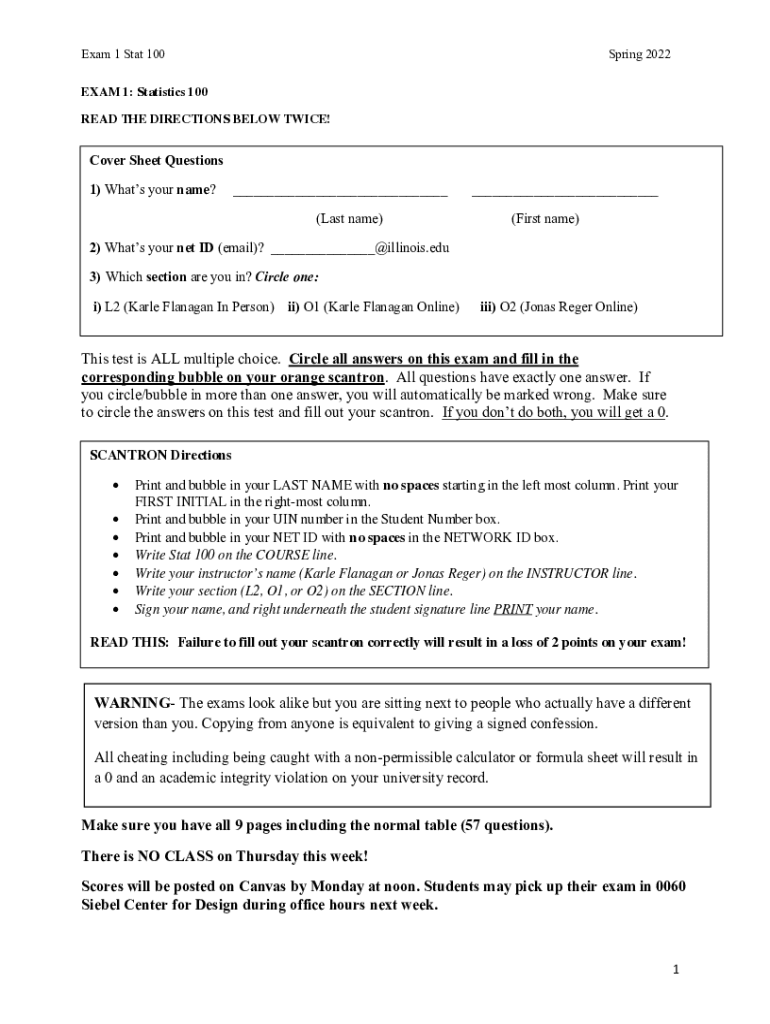 Exam 1 Stat 100Spring 2022EXAM 1: Statistics 100 READ THE DIRECTIONS BELOW TWICE! Cover Sheet Questions 1) What's your name?___ (Last name)___ (First name)2) What's your net ID (email)? ___@illinois.edu