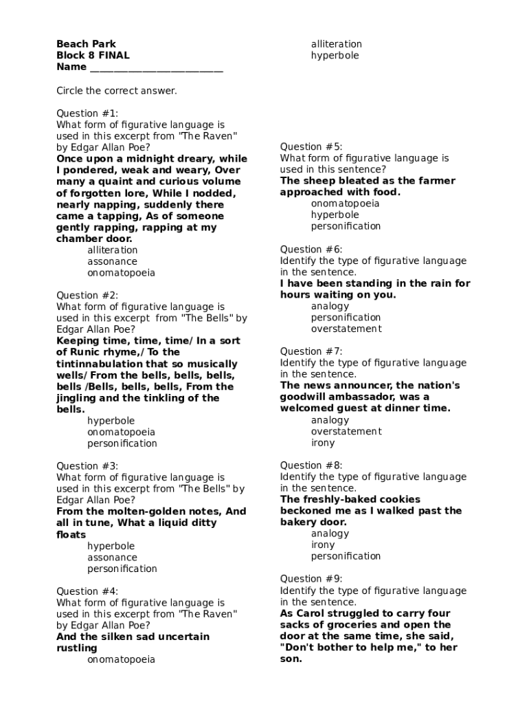 The Beach Park Block 8 Mastery Assessment Name Circle the correct is a document that should be submitted to the required address in order to provide certain information. It must be filled-out and signed, which is possible manually in hard copy, or via a particular software e. g. PDFfiller. It allows to complete any PDF or Word document directly in your browser, customize it according to your needs and put a legally-binding electronic signature. Once after completion, you can send the Beach Park Block 8 Mastery Assessment Name Circle the correct to the relevant receiver, or multiple ones via email or fax. The blank is printable as well from PDFfiller feature and options offered for printing out adjustment. In both digital and physical appearance, your form should have a neat and professional outlook. You may also turn it into a template to use later, so you don't need to create a new blank form from the beginning. All that needed is to edit the ready document.