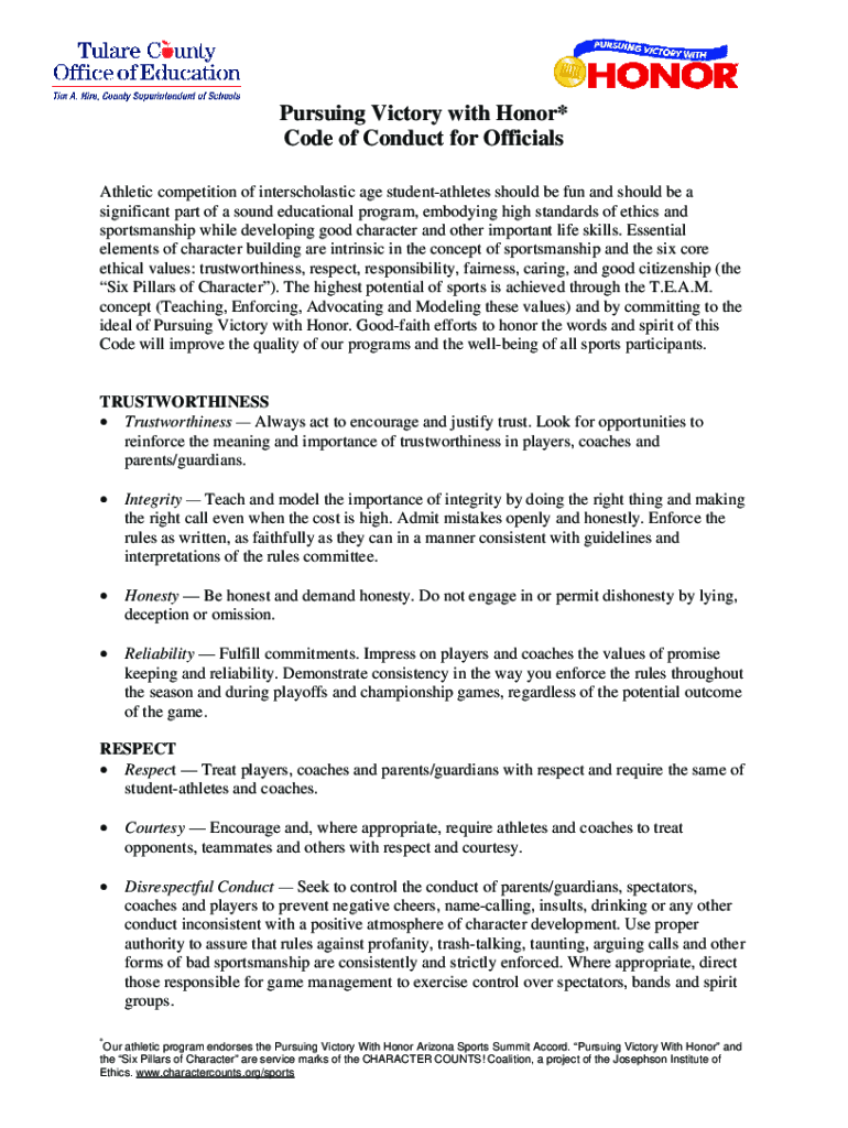 Pursuing Victory with Honor* Code of Conduct for Officials Athletic competition of interscholastic age student athletes should be fun and should be a significant part of a sound educational program,
