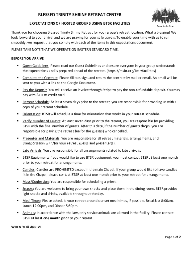 BLESSED TRINITY SHRINE RETREAT CENTER EXPECTATIONS OF HOSTED GROUPS USING BSR FACILITIES Thank you for choosing Blessed Trinity Shrine Retreat for your group\'s retreat location. What a blessing!