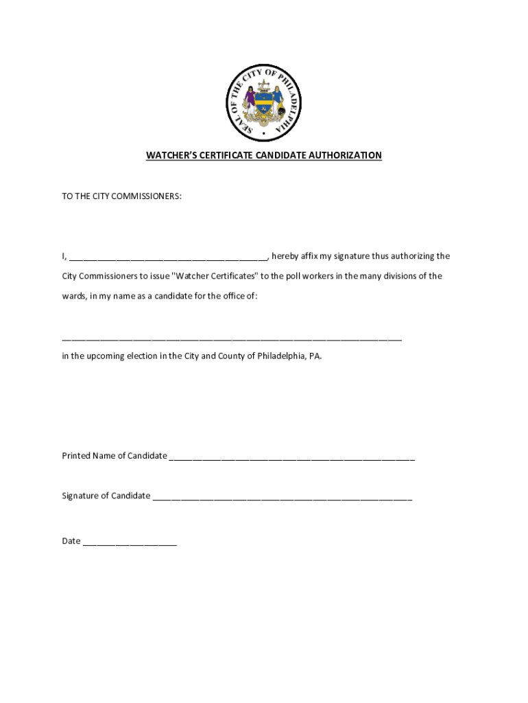 WATCHERS CERTIFICATE CANDIDATE AUTHORIZATION TO THE CITY COMMISSIONERS:I, ___, hereby affix my signature thus authorizing the City Commissioners to issue \” Watcher Certificates\” to the poll