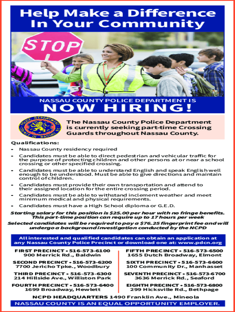 Help Make a Difference In Your CommunityNASSAU COUNTY POLICE DEPARTMENT SNOW HIRING! The Nassau County Police Department is currently seeking part-time Crossing Guards throughout Nassau County. Qualifications: