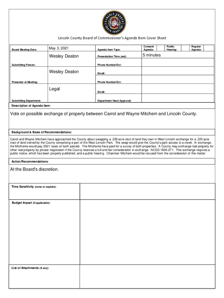Lincoln County Board of Commissioners Agenda Item Cover Sheet Board Meeting Date:May 3, 2021Agenda Item Type:Wesley DeatonPresentation Time (est):Submitting Person:Consent Agenda:Public Hearing:Regular