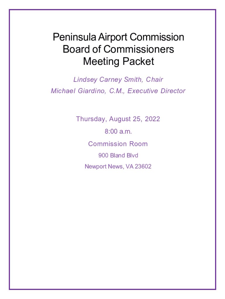 Peninsula Airport Commission Board of Commissioners Meeting Packet Lindsey Carney Smith, Chair Michael Guarding, C.M., Executive Director Thursday, August 25, 2022 8:00 a.m. Commission Room 900 Bland