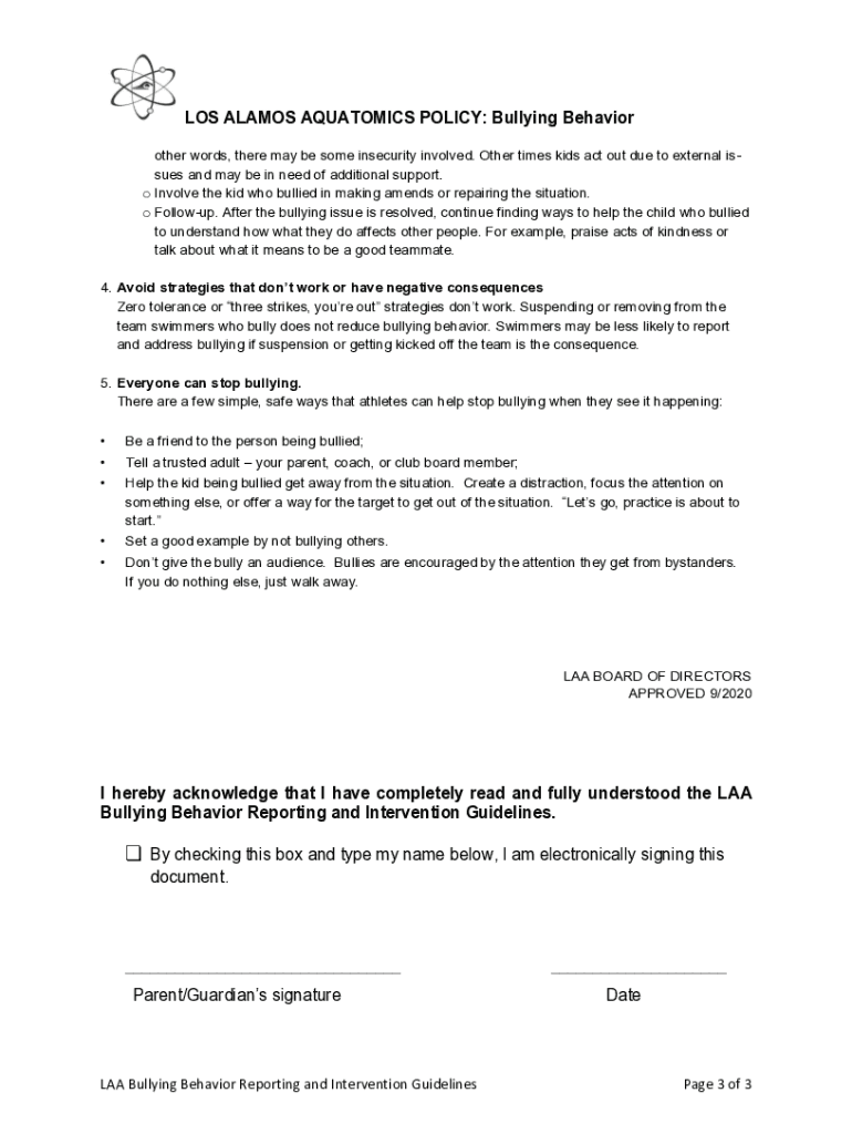 Bullying policy should be filled out by reviewing the guidelines provided and adapting them to the specific needs and rules of the aquatics facility.