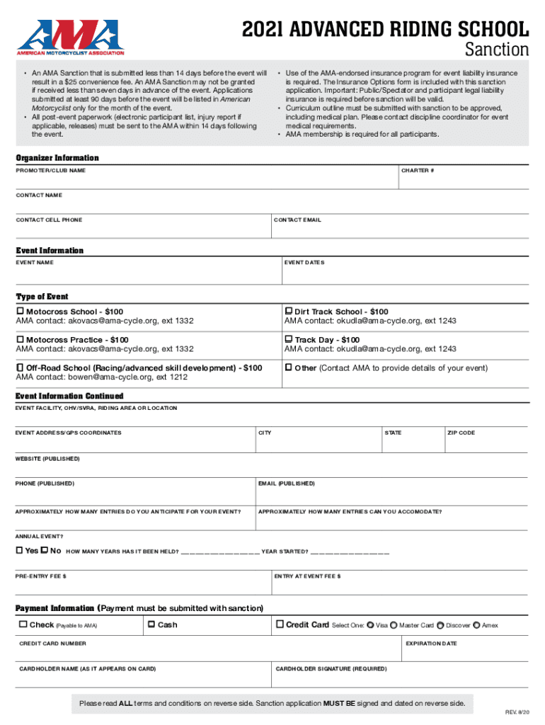 2021 ADVANCED RIDING SCHOOL Sanctioned AMA Sanction that is submitted less than 14 days before the event will result in a $25 convenience fee. An AMA Sanction may not be granted if received less than