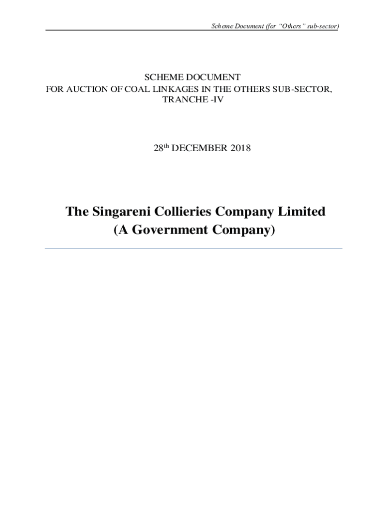 Scheme Document (for Others subsector)SCHEME DOCUMENT FOR AUCTION OF COAL LINKAGES IN THE OTHERS SUBSECTION, TRANCHE IV28th DECEMBER 2018The Singeing Collieries Company Limited (A Government Company)Scheme