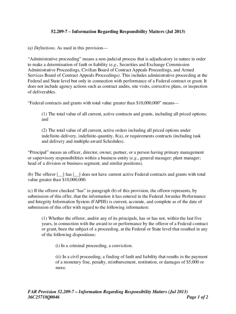 52.2097 Information Regarding Responsibility Matters (Jul 2013)(a) Definitions. As used in this provision Administrative proceeding means a nonjudicial process that is adjudicatory in nature in order