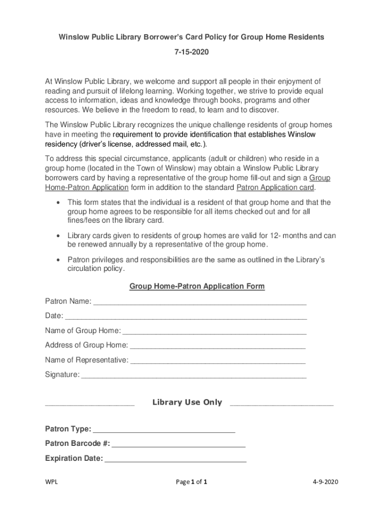 Winslow Public Library Borrowers Card Policy for Group Home Residents 7152020At Winslow Public Library, we welcome and support all people in their enjoyment of reading and pursuit of lifelong learning.