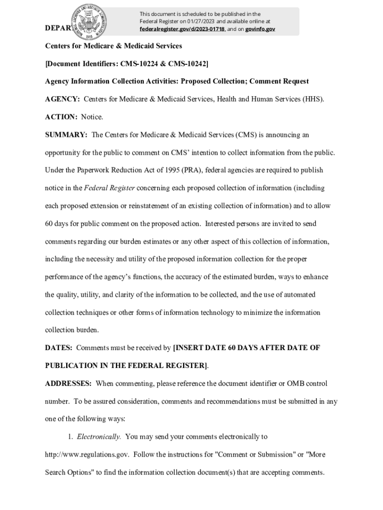 DEPARTMENT OFT his document is scheduled to be published in the Federal Register on 01/27/2023 and available online at HEALTH AND HUMAN SERVICES federalregister.gov/d/202301718, and on gov info. Centers
