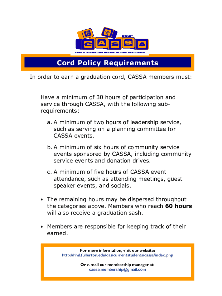 Cord Policy Requirements In order to earn a graduation cord, CASSIA members must: Have a minimum of 30 hours of participation and service through CASSIA, with the following subrequirements: a. A minimum