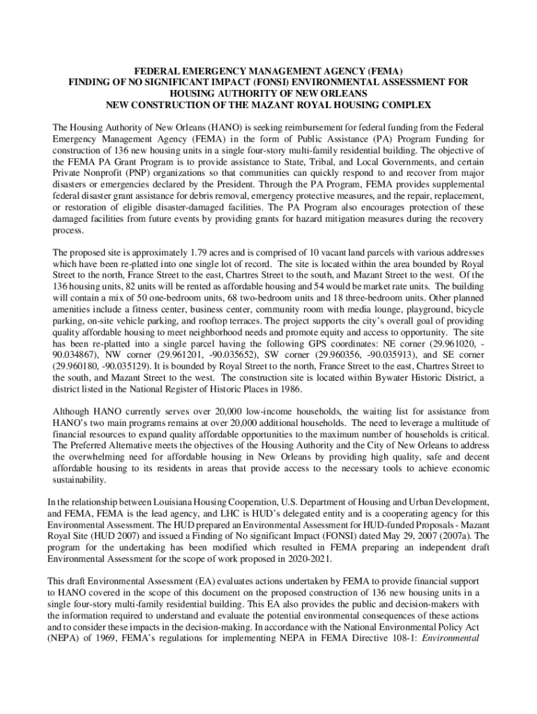 FEDERAL EMERGENCY MANAGEMENT AGENCY (FEMA) FINDING OF NO SIGNIFICANT IMPACT (FANS) ENVIRONMENTAL ASSESSMENT FOR HOUSING AUTHORITY OF NEW ORLEANS NEW CONSTRUCTION OF THE MEANT ROYAL HOUSING COMPLEX
