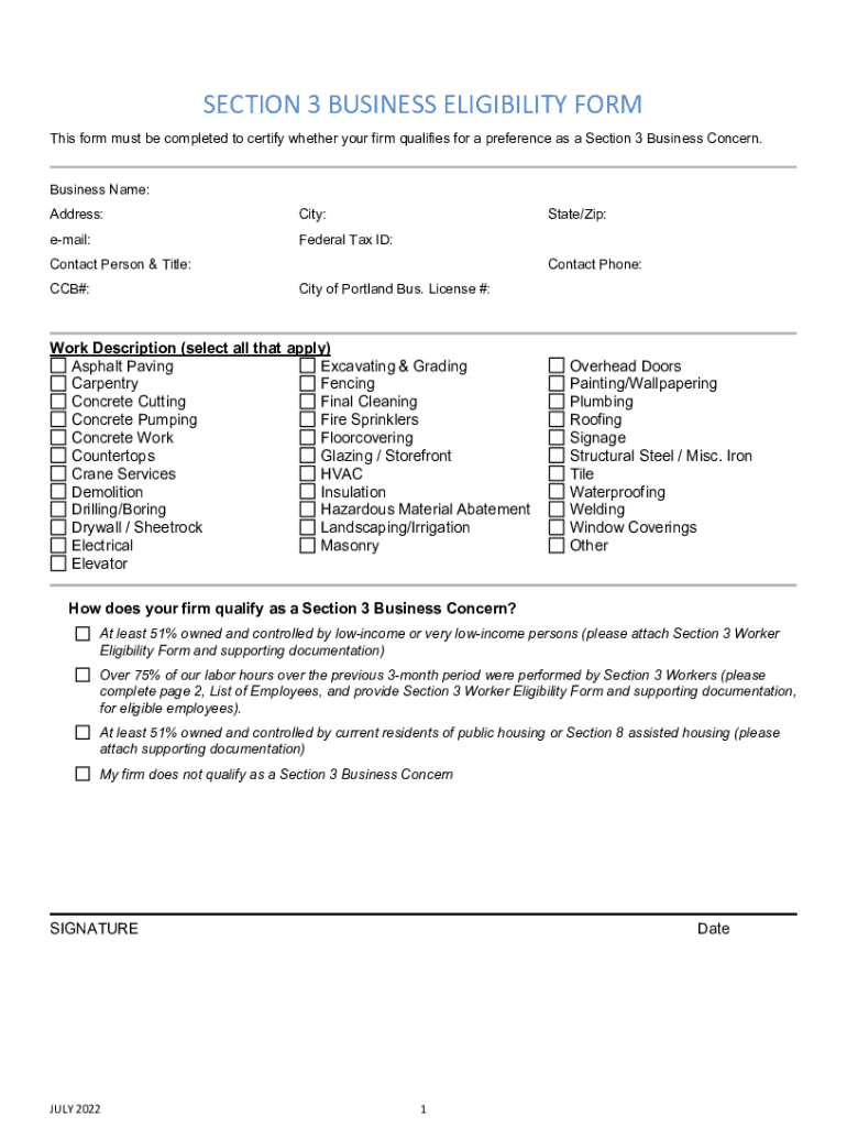 SECTION 3 BUSINESS ELIGIBILITY From This form must be completed to certify whether your firm qualifies for a preference as a Section 3 Business Concern. Business Name: Address:City:email:Federal Tax