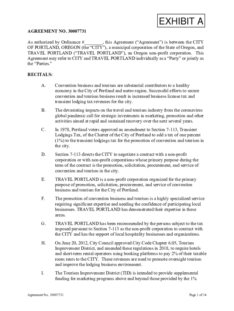 EXHIBIT A AGREEMENT NO. 30007731 As authorized by Ordinance #___, this Agreement (Agreement) is between the CITY OF PORTLAND, OREGON (the CITY), a municipal corporation of the State of Oregon, and