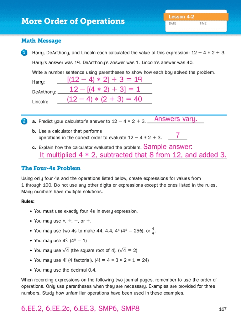 Lesson 42More Order of OperationsDATE Timeout Message 1Harry, Anthony, and Lincoln each calculated the value of this expression: 12 4 2 + 3. Harry's answer was 19. Anthony answer was 1. Lincolns answer