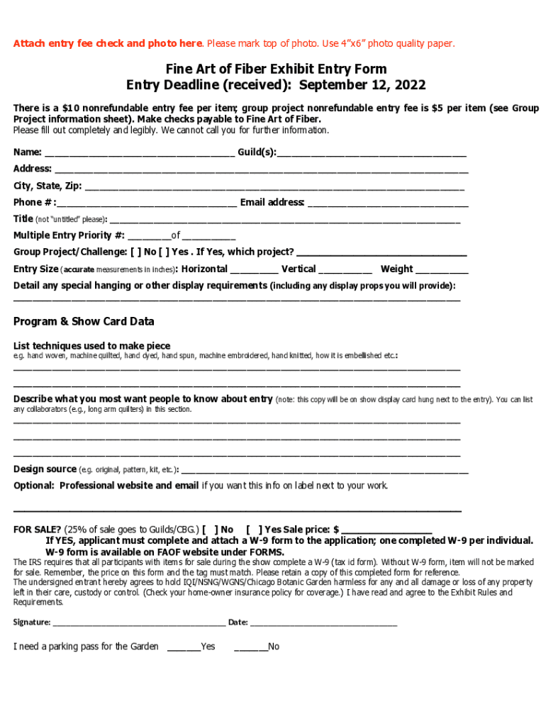 Attach entry fee check and photo here. Please mark top of photo. Use 4×6 photo quality paper. Fine Art of Fiber Exhibit Entry Form Entry Deadline (received): September 12, 2022, There is a $10 nonrefundable