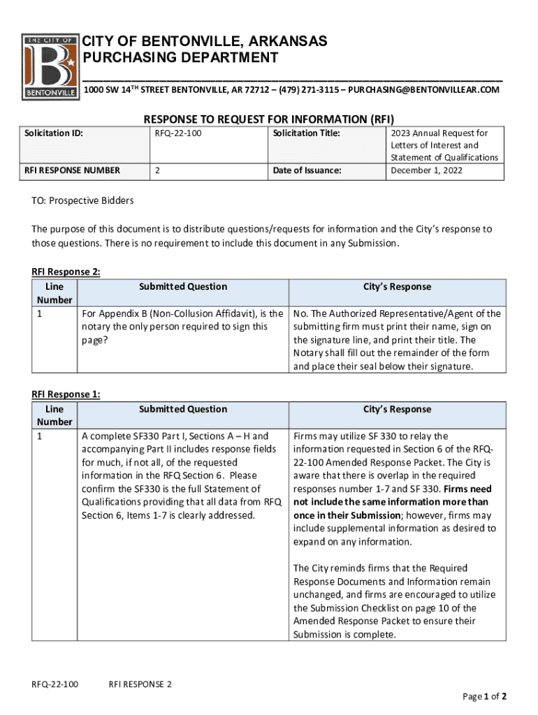 CITY OF BENTONVILLE, ARKANSAS PURCHASING DEPARTMENT ___ 1000 SW 14TH STREET BENTONVILLE, AR 72712 (479) 2713115 PURCHASING@BENTONVILLEAR.COMRESPONSE TO REQUEST FOR INFORMATION (RFI)Solicitation ID: