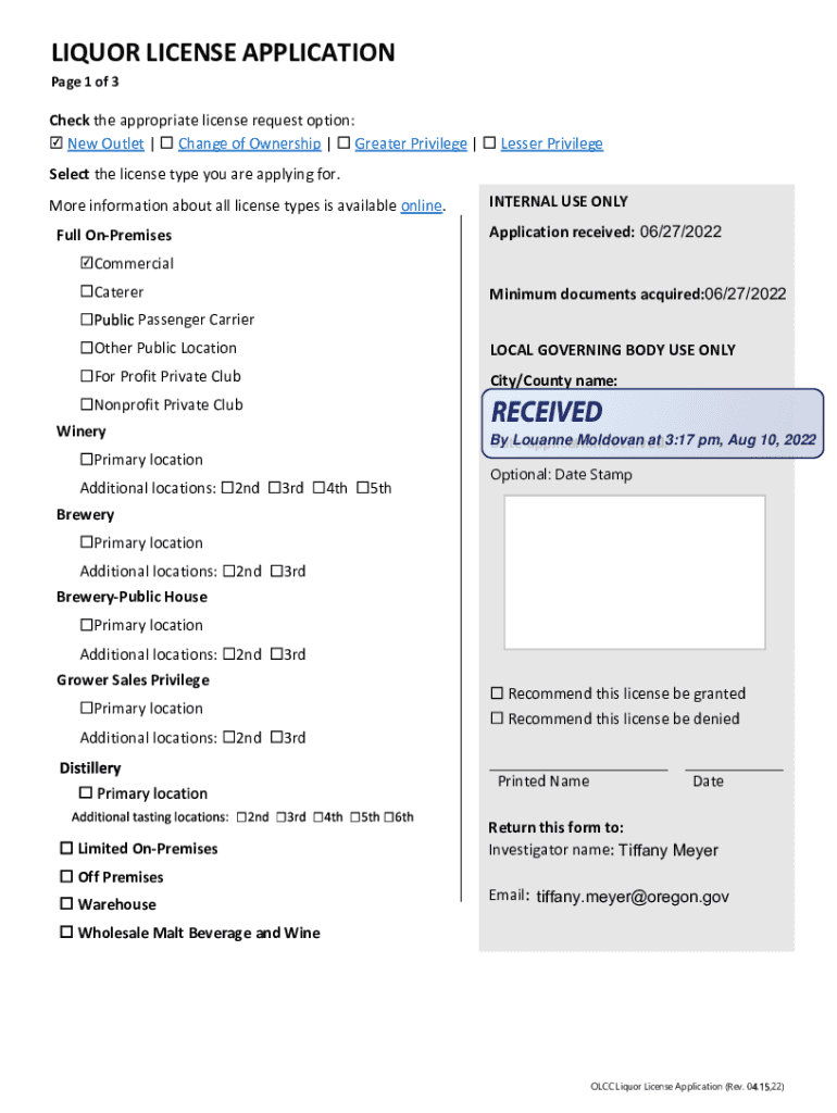 LIQUOR LICENSE APPLICATION Page 1 of 3Check the appropriate license request option: New Outlet | Change of Ownership | Greater Privilege |Lesser Privilege Select the license type you are applying
