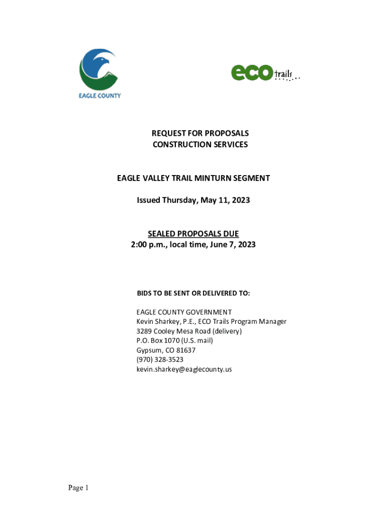 REQUESTFORPROPOSALS CONSTRUCTIONSERVICES EAGLEVALLEYTRAILMINTURNSEGMENT Issued Thursday,May11,2023 SEALEDPROPOSALSDUE 2:00p.m., local time,June7,2023 BIDSTOBESENTORDELIVEREDTO: Page 1EAGLECOUNTYGOVERNMENT