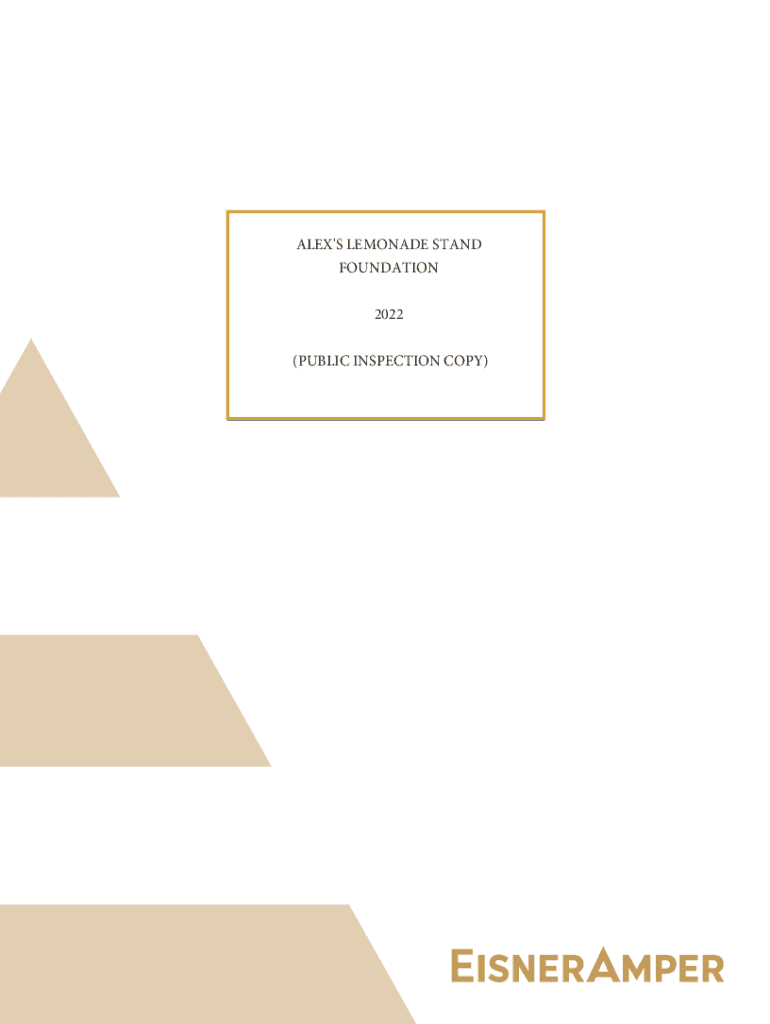 ALEX\'S LEMONADE STAND FOUNDATION 2022 (16#*$*/41&$5×0/$01:)Eisner Advisory Group LLC One Logan Square 130 North 18th Street, Suite 3000 Philadelphia, PA 19103 T 215.881.8800 F 215.881.8801MAY 11,
