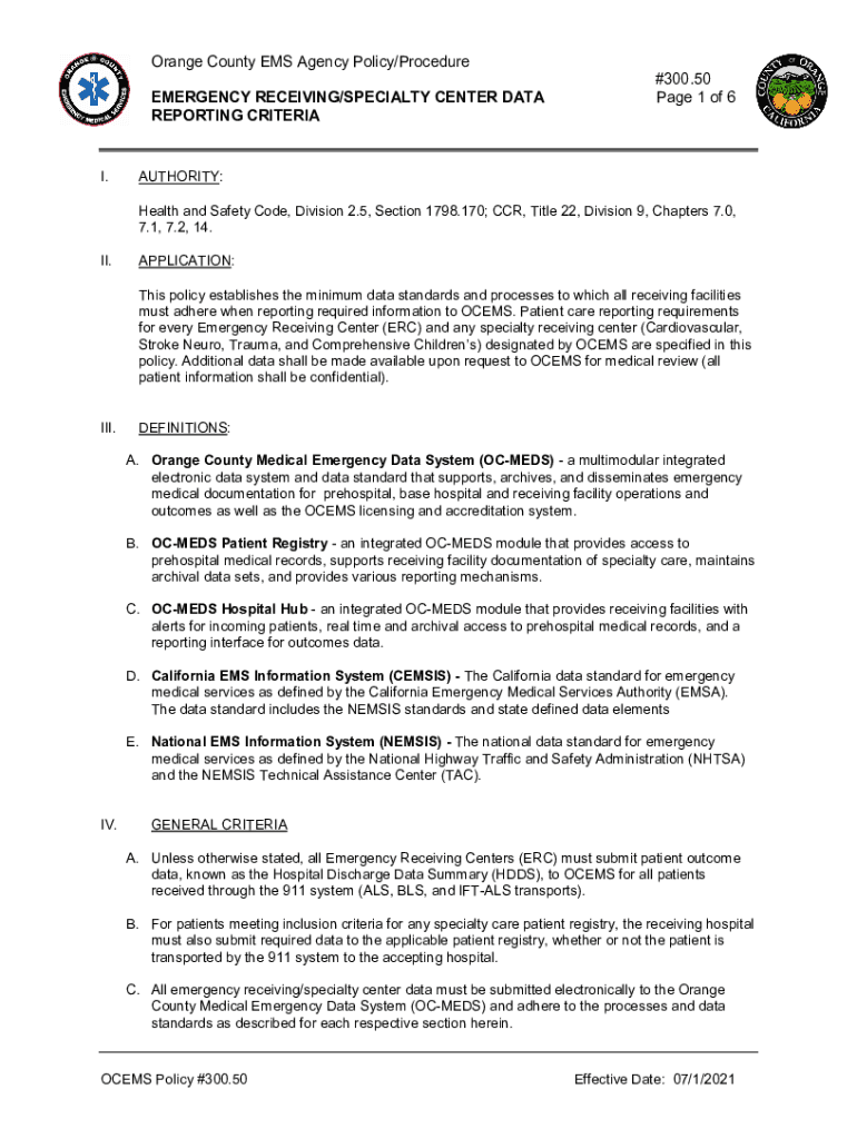 Orange County EMS Agency Policy/Procedure EMERGENCY RECEIVING/SPECIALTY CENTER DATA REPORTING CRITERIA.#300.50-Page 1 of 6AUTHORITY: Health and Safety Code, Division 2.5, Section 1798.170; CCR, Title