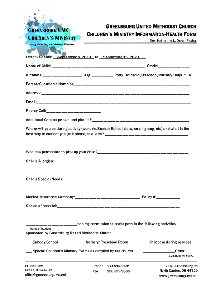 GREENSBURG UMC CHILDREN MINISTRYGREENSBURG UNITED METHODIST CHURCH CHILDREN MINISTRY INFORMATIONHEALTH FORM Rev. Katherine L. Osier, Pastoring, Growing, and Helping TogetherEffective dates:September