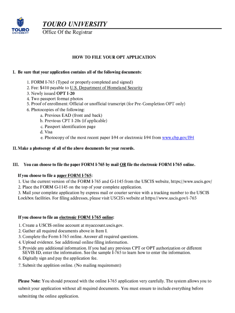 TOUR UNIVERSITY Office Of the Registration TO FILE YOUR OPT APPLICATION I. Be sure that your application contains all the following documents: 1. FORM I765 (Typed or properly completed and signed)
