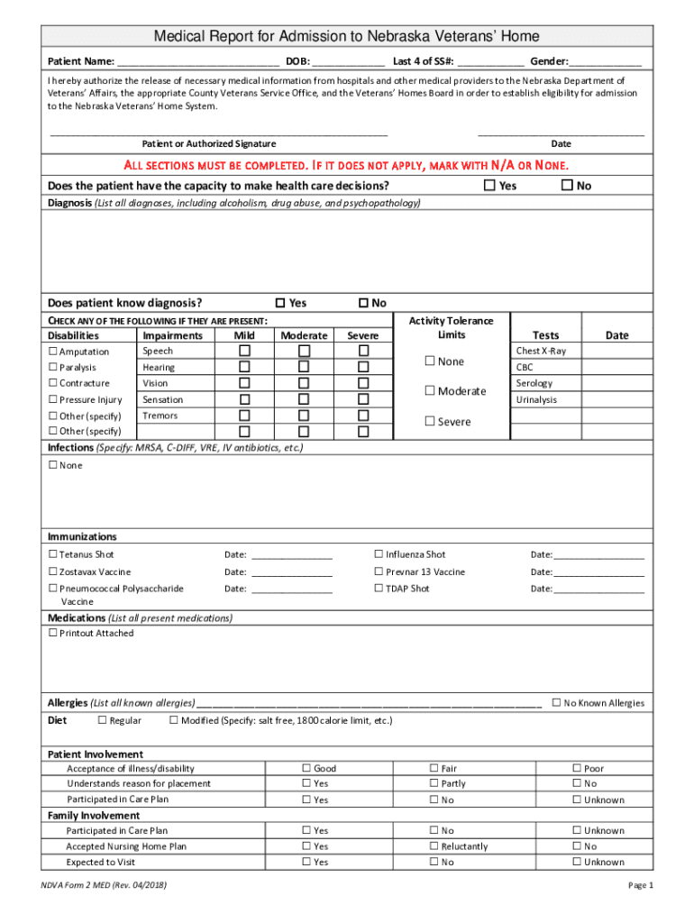 Medical Report for Admission to Nebraska Veterans Home Patient Name: ___ DOB: ___ Last 4 of SS#: ___ Gender:___ I hereby authorize the release of necessary medical information from hospitals and other