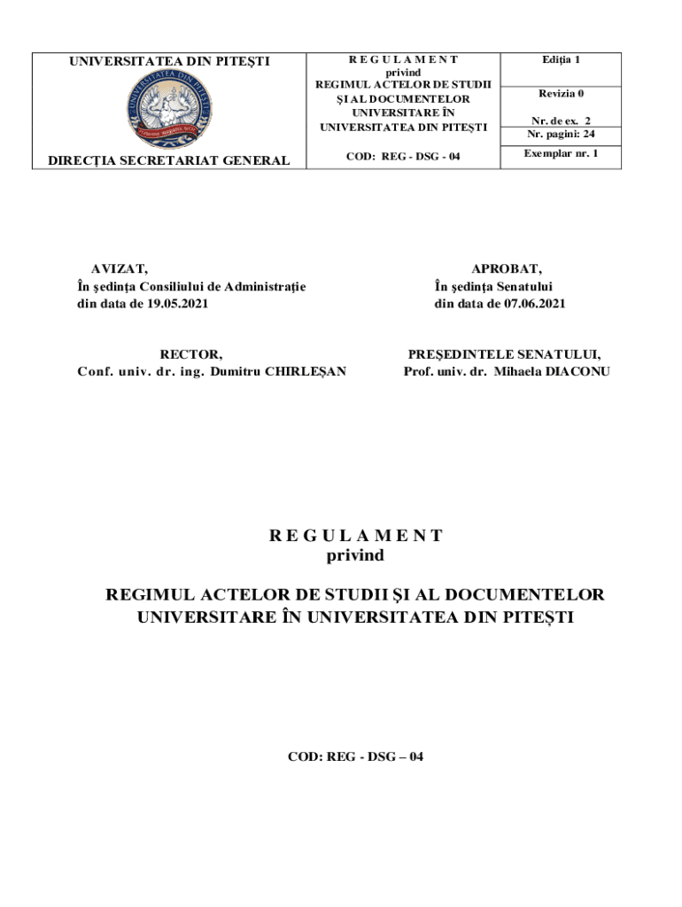 UNIVERSITIES DIN PITETIDIRECIA SECRETARIAT GENERAL COD: REG DSG 04AVIZAT,