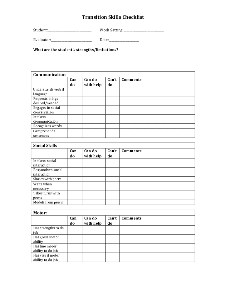 Transition Skills ChecklistStudent:___Work Setting:___Evaluator:___Date:___What are the students strengths/limitations? CommunicationCanCan doCantCommentsdowith helpdoUnderstands verballanguageRequests