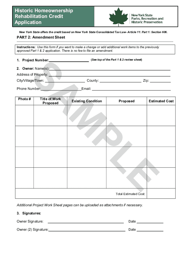 Historic Homeownership Rehabilitation Credit Application New York State offers the credit based on New York State Consolidated Tax Law Article 11: Part 1: Section 606.PART 2: Amendment Sheet Instructions: