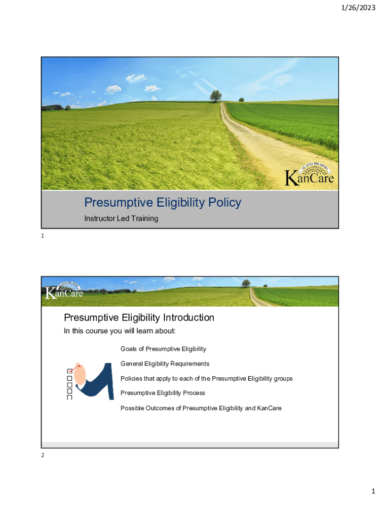 1/26/2023Presumptive Eligibility Policy Instructor Led Training 1Presumptive Eligibility Introduction In this course you will learn about: Goals of Presumptive Eligibility General Eligibility Requirements