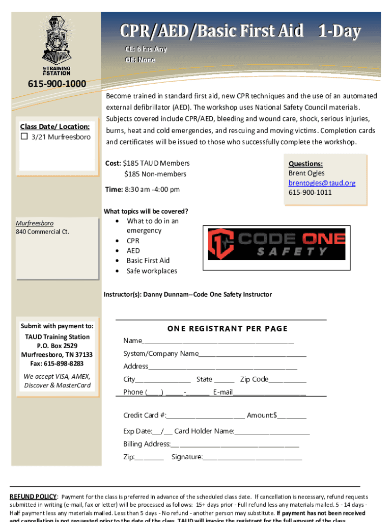 CPR/AED/Basic First Aid 1Day 11CCddEEa:a:y6y6 Harris Nanny O ONE:: NNoonnee6159001000Class Date/ Location: 3/21 MurfreesboroBecome trained in standard first aid, new CPR techniques and the use of